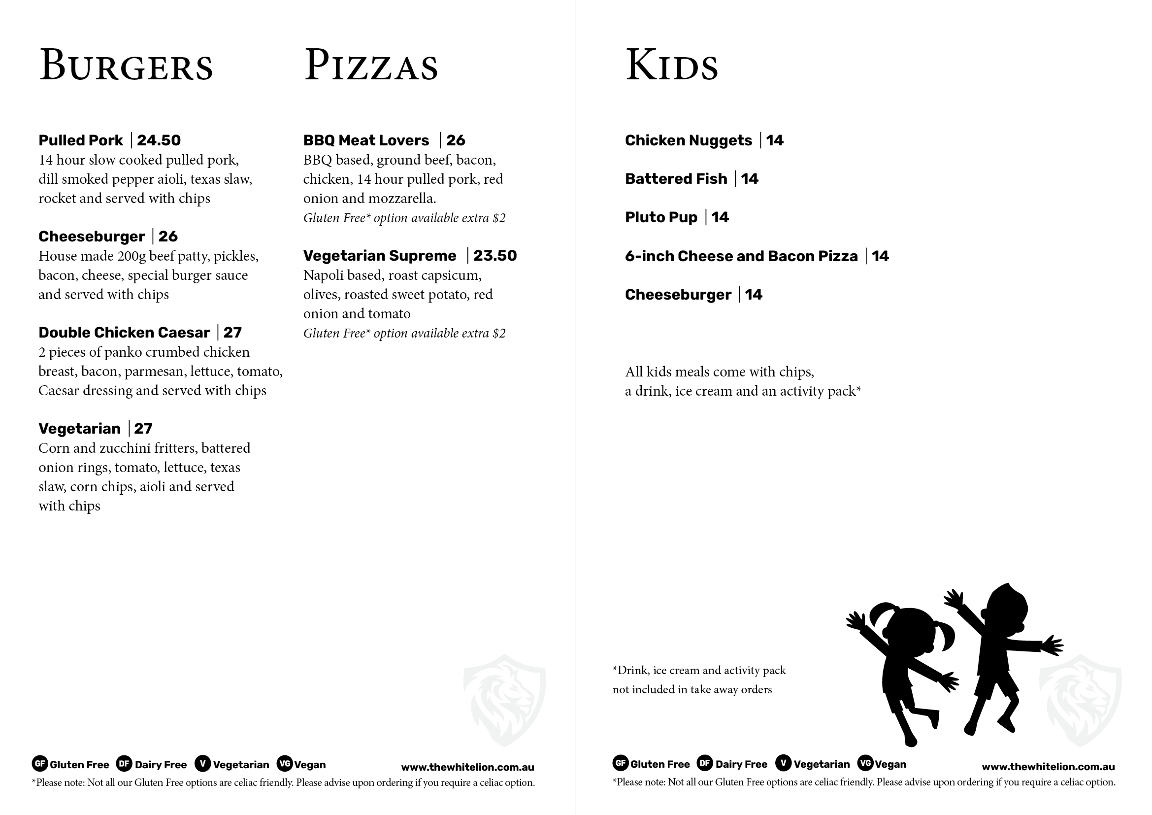 In conjunction with the Office of Liquor and Gaming Regulation (OLGR) legislation around Minors on licensed premises, The White Lion Hotel’s House Policy is that all minors must be accompanied by an adult who can hold parental guardianship over the minor. Online bookings made by minors without appropriate adult supervision may be declined. We appreciate your understanding and cooperation in helping us comply with our licensing obligations.